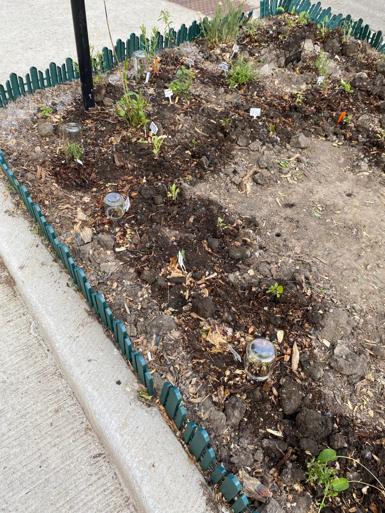 There is always what you intend, and then what actually happens. Despite spending the cold winter months planning out a “perfect” garden, such a thing has yet to materialize. In part because I forgot a gardener’s biggest enemy – bunnies. Apparently, the sweet baby plants that Steph and I added are too tempting to the local bunny community and rather than growing, have been making an excellent salad. I’ve taken to placing glass jars over the plants that I want to protect to see if that has any effect. They actually seem to be helping a little during this drought as condensation gathers inside the glass rather than evaporating into the air.