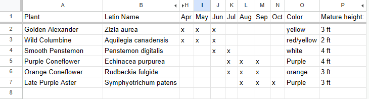 - Three each of Golden Alexander (Zizia aurea), Late Purple Aster (Symphyotrichum patens), Purple Coneflower (Echinacea purpurea), Smooth Penstemon (Penstemon digitalis), and Wild Columbine (Aquilegia canadensis)