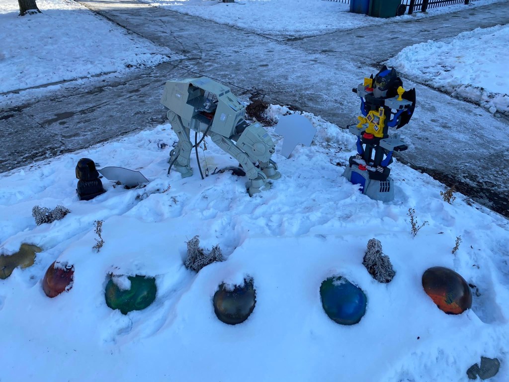 You may remember the delightful garden featuring bowling ball planets with an AT-AT and a box of action figures for anyone to take. Unfortunately, it seems that garden has now “become one with The Force”. The corner is currently empty and in need of a new steward. I am considering taking on the garden and would like to hear your ideas for what you’d like to see there. Please take a moment to fill out this survey and share your thoughts: https://forms.gle/hAJcSi7MMjY3eHsG9 or use the QR code below.